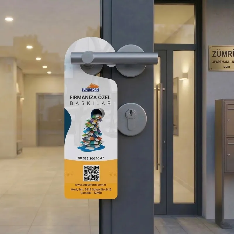 Kapı kolu askıları, oteller, ofisler, restoranlar ve diğer işletmelerde dikkat çekici ve pratik bir tanıtım aracı olarak kullanılan etkili bir üründür. Kapı kolu askıları, müşterilerinizin veya misafirlerinizin kapılarda fark edeceği ve doğrudan mesajınızı iletebileceğiniz reklam araçlarıdır. Süperform Matbaacılık A.Ş. olarak, kapı kolu askılarınızı yüksek kaliteli malzemeler ve baskı teknikleri kullanarak üretiyor, işletmenizin marka imajını güçlendirecek çözümler sunuyoruz.